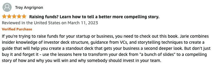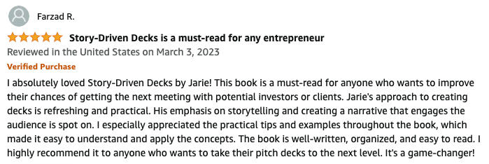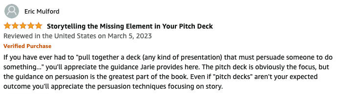 One of the most important aspects of a pitch deck is that it tells a story that gets you the next meeting. Too often, people jam too much information into a slide deck that will never get used.
